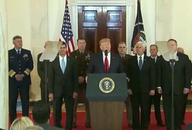 અમેરિકા અને ઈરાન વચ્ચેના તણાવ મુદ્દે અમેરિકાના રાષ્ટ્રપતિ ડોનાલ્ડ ટ્રમ્પે બુધવારના રોજ પત્રકાર પરિષદને સંબોધી હતી. ડોનાલ્ડ ટ્રમ્પે જણાવ્યું હતું કે, અમને કોઈ નુકસાન થયું નથી. માત્ર બે લોકો સામાન્ય ઈજાગ્રસ્ત થયા છે. કોઈપણ અમેરિકી સૈનિકનું મોત નીપજ્યું નથી. હું અમેરિકન સેનાની હિંમતની પ્રસંશા કરું છું તેમને સલામ કરું છું. ઈરાન વિશ્વમાં મોટા સ્તરે આતંકવાદીઓને સમર્થન આપી રહ્યું છે. અમે થોડા દિવસ પહેલા એક એવા આતંકવાદીને પાડી દીધો હતો કે જે અમેરિકા તથા અમેરિકન નાગરિકોને ધમકીઓ આપી રહ્યો હતો. સુલેમાની ઘણા આતંકવાદી સંગઠનોને પોતાનું સમર્થન આપી રહ્યો હતો.