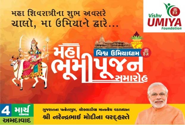વડાપ્રધાન નરેન્દ્ર મોદીની ઉપસ્થિતિમાં વિશ્વ ઉમિયાધામનું મહા ભૂમિપૂજન આગામી તા.૪ માર્ચે મહાશિવરાત્રિના પવિત્ર દિવસે એસ.જી. હાઈવે ખાતે વૈષ્ણોદેવી સર્કલ નજીક જાસપુર ગામ પાસે થશે. આ અંગેની વિગતો પત્રકારોને આપતાં વિશ્વ ઉમિયા ફાઉન્ડેશનના મુખ્ય સંયોજક સી.કે. પટેલે જણાવ્યું કે પાટીદારોનાં વૈશ્વિક મથક એવા અમદાવાદમાં વડાપ્રધાન નરેન્દ્ર મોદીની ઉપસ્થિતિમાં વિશ્વ ઉમિયાધામનું મહા ભૂમિપૂજન થશે. આ પ્રસંગે મુખ્યમંત્રી વિજયભાઈ રૂપાણી, નાયબ મુખ્યમંત્રી નીતિનભાઈ પટેલ, સ્વામી સચ્ચિદાનંદજી મહારાજ-દંતાલી, જગન્નાથજી મંદિરના મહંત દિલીપદાસજી મહારાજ ઉપસ્થિત રહેશે. સાથે જ વિદેશથી NRI, અન્ય રાજ્યોમાંથી પણ પાટીદારો આવશે. આ મહોત્સવમાં ઉપસ્થિત રહેવા માટે પાંચ લાખ કરતાં વધુ આમંત્રણ પત્રિકા પાઠવવામાં આવી છે.